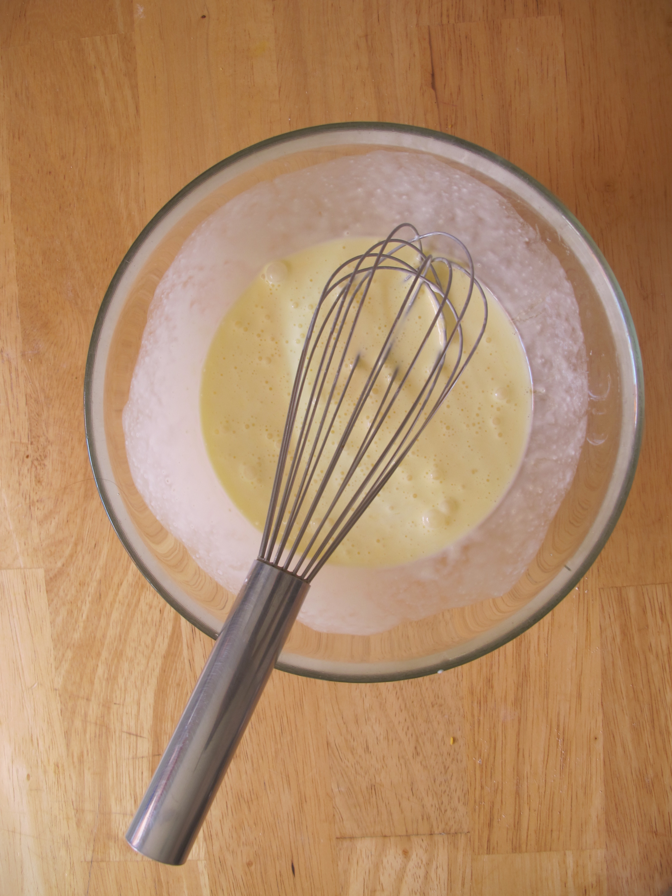 After 20 minutes if your yeast has passed the test, add the yeast solution along with the remaining cup of lukewarm water to the well of the dry ingredients.